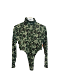 A bodysuit featuring an original camouflage pattern mixed with alien, UFO, and daruma motifs.
