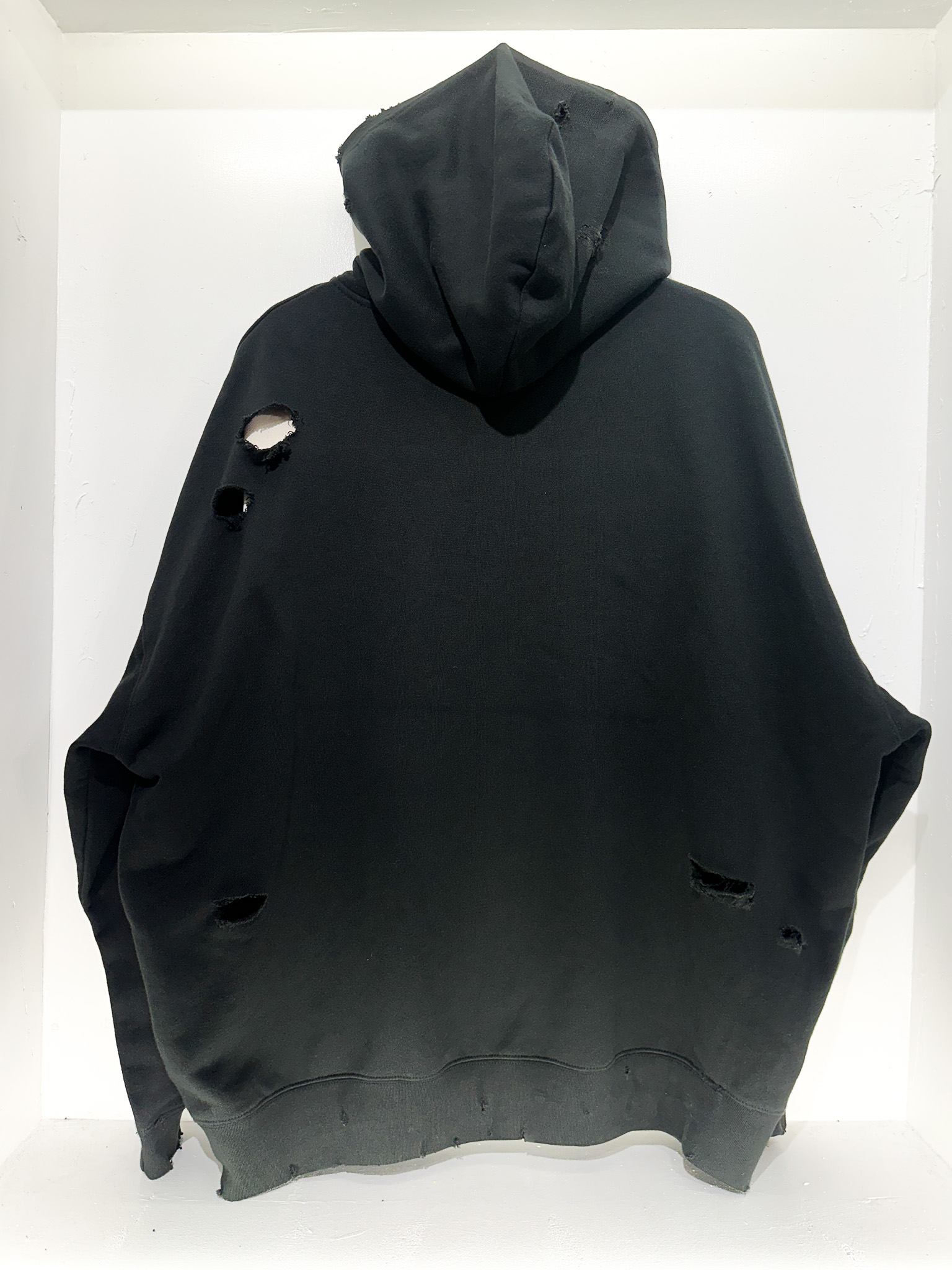 計算されたダメージ加工が奥行きある表情を生み、スタイリングに深みをプラス。素材には上質な綿100%パイルを使用し、柔らかな着心地と適度な厚みを両立しています。
