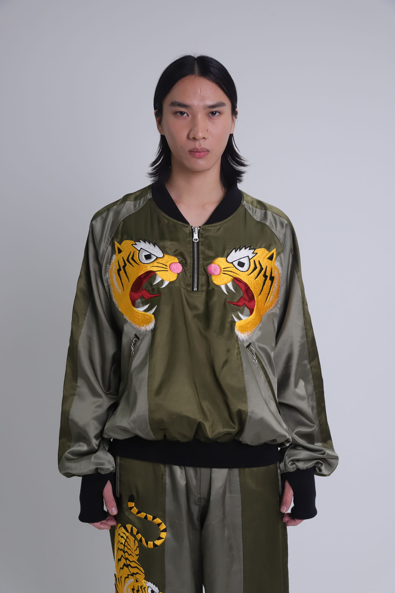 中央の虎の刺繍が目を惹くハーフジップジャケット。Maison Shun Ishizawaが得意とする「横振り刺繍」を贅沢に施した高級感あふれるアイテムです。