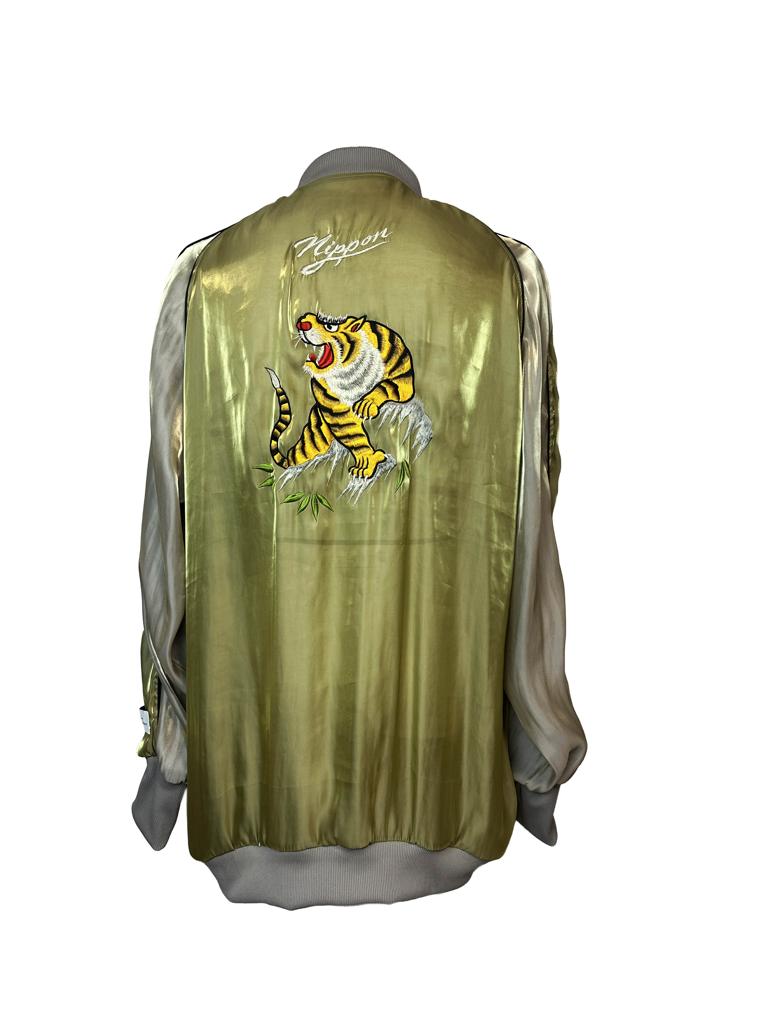 Crafted from a sheer, translucent fabric, this souvenir jacket blends lightness with a distinctive sense of presence.